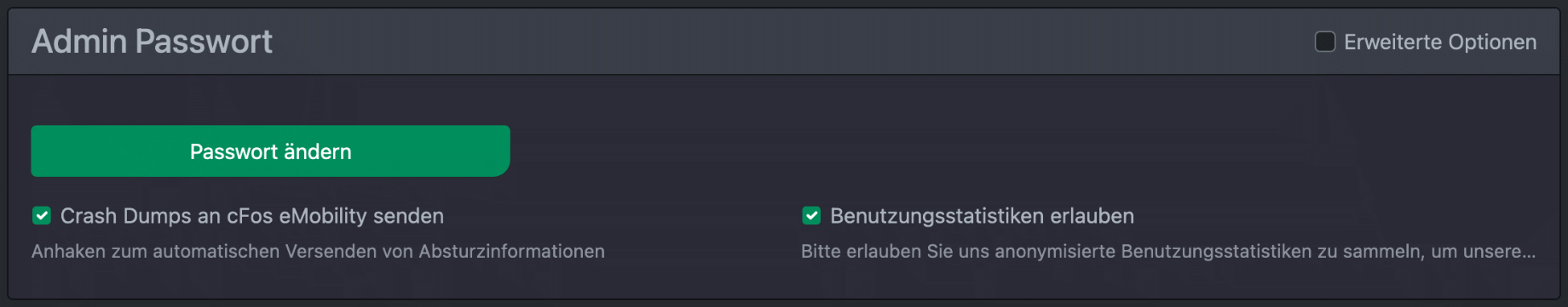 Sie sollten bei der ersten Benutzung das Admin Passwort ändern. Notieren Sie es sich gut, damit Sie sich nicht selbst aussperren! Das Standardpasswort für den cFos Charging Manager ist leer. Der Benutzername ist immer admin.